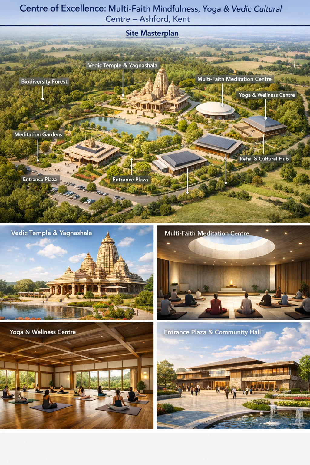 Sanatan SEVA Charitable Trust is committed to building a landmark civic, spiritual, and economic infrastructure project for Ashford, Kent. Our Centre of Excellence will be a beacon of Multi-faith Mindfulness, Yoga, Meditation, and Vedic awakening, providing a truly inclusive space.
